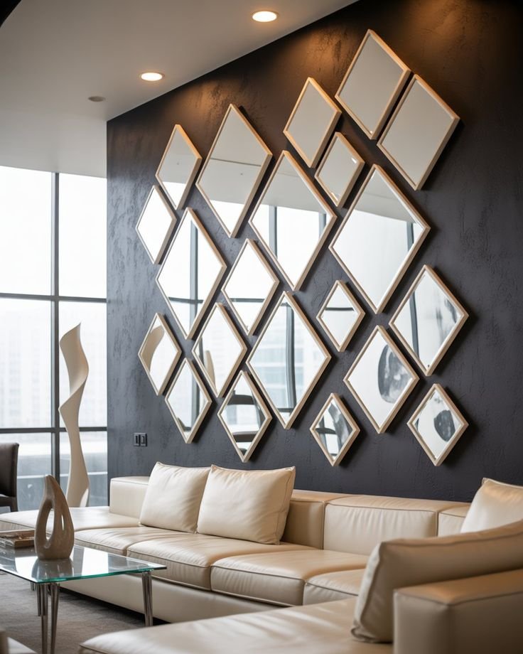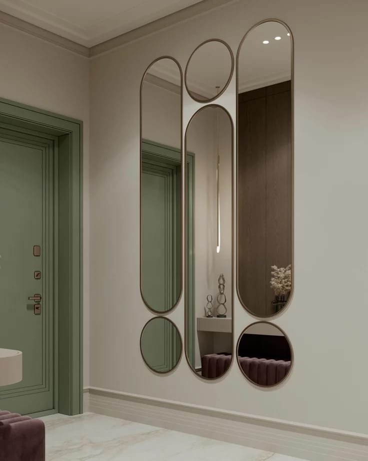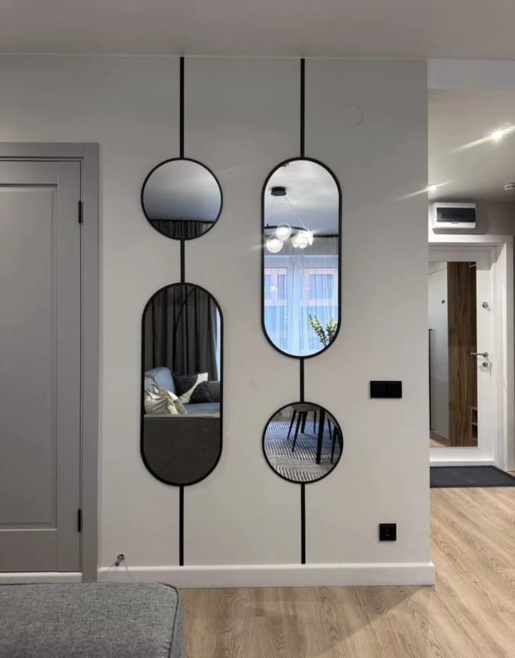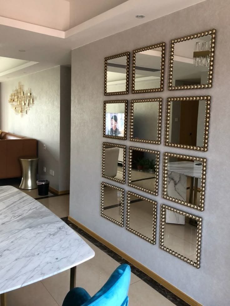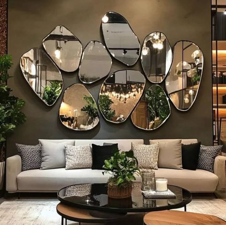 تُركب على شكل مجموعات أو أشكال هندسية مختلفة مثل الدوائر، المستطيلات، أو التصاميم العشوائية. تمنح هذه المرايا تأثيرًا بصريًا مذهلًا وتصبح قطعة فنية رئيسية في الغرفة. يمكن تركيبها بشكل متدرج على الجدار لتزيين كامل المساحة أو لتقسيم الجدار إلى أقسام بصرية مختلفة.