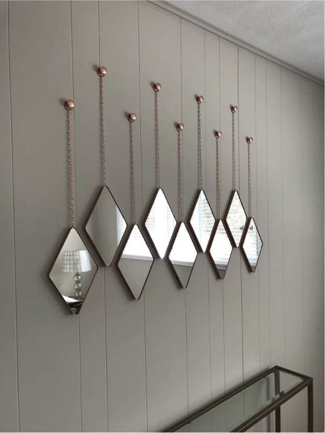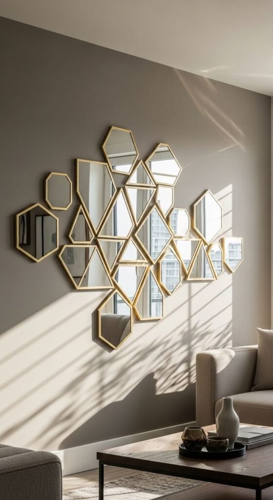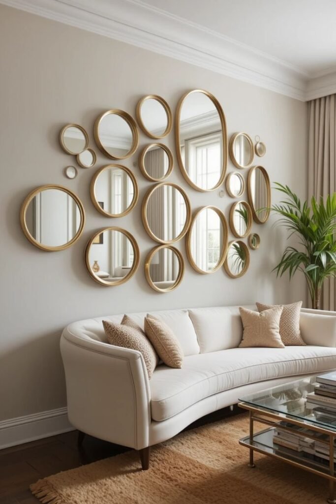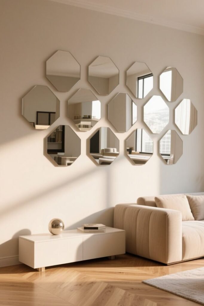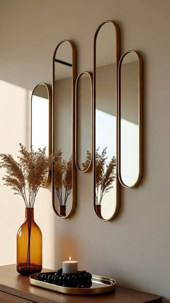 تُركب على شكل مجموعات أو أشكال هندسية مختلفة مثل الدوائر، المستطيلات، أو التصاميم العشوائية. تمنح هذه المرايا تأثيرًا بصريًا مذهلًا وتصبح قطعة فنية رئيسية في الغرفة. يمكن تركيبها بشكل متدرج على الجدار لتزيين كامل المساحة أو لتقسيم الجدار إلى أقسام بصرية مختلفة.