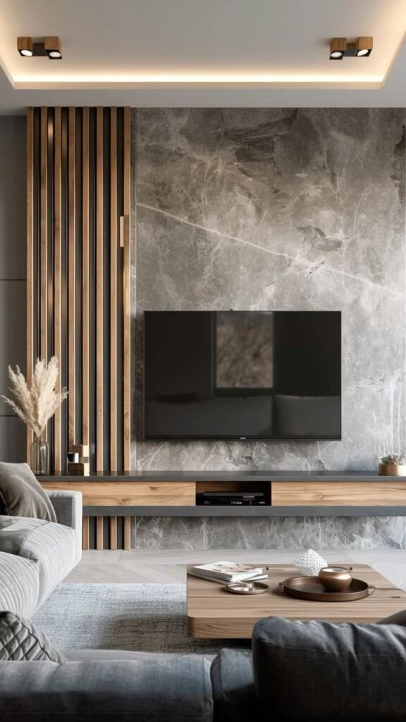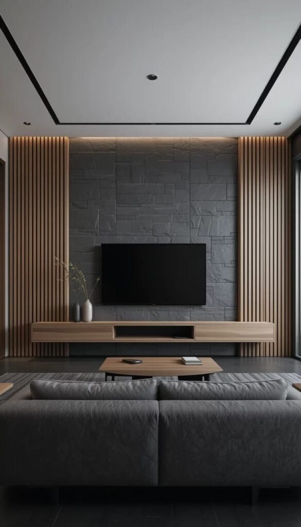 - جدران رأسيّة بلمسات خشبية داكنة لإضفاء فخامة.