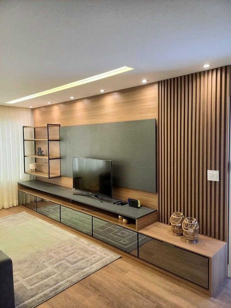 أحد أبرز الاستخدامات الحالية لـ بديل الخشب هو تصميم خلفيات شاشات التلفزيون داخل غرف المعيشة أو الصالات. بدلاً من الاعتماد على الدهانات أو ورق الجدران فقط، يمكن استخدام ألواح بديل الخشب لتوفير خلفية فاخرة تحيط بالتلفزيون، مع إضافة الرفوف والأرفف التخزينية المتناسقة.