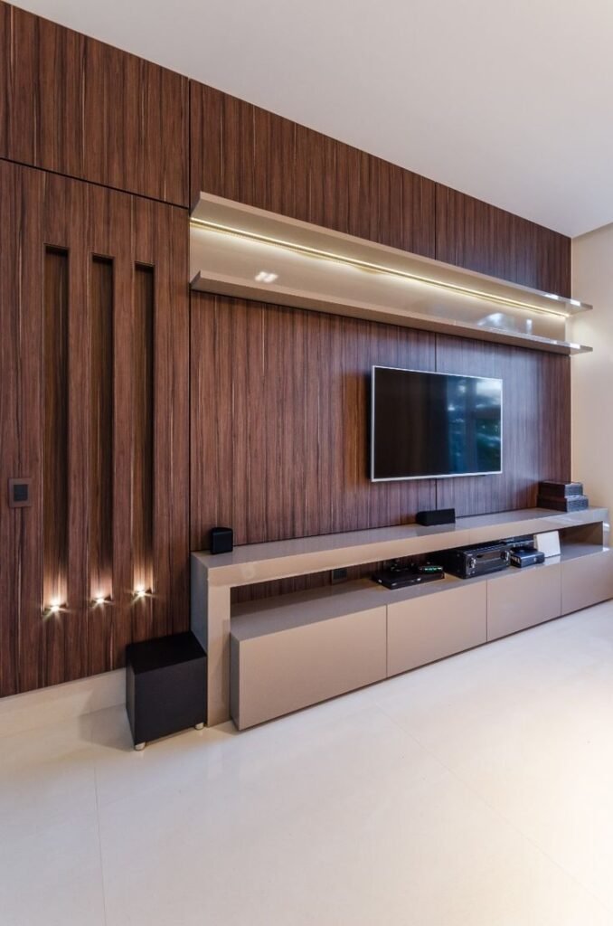 - تصميم الحوائط متعددة الوظائف: يمكن دمج رفوف مكتبية أو رفوف عرض فنية ضمن خلفية الخشب.