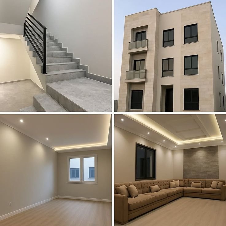 - الألوان الهادئة والمحايدة: الأبيض العاجي، الرمادي الدافئ، والتي تتناسب مع جميع أثاثات الشقق.