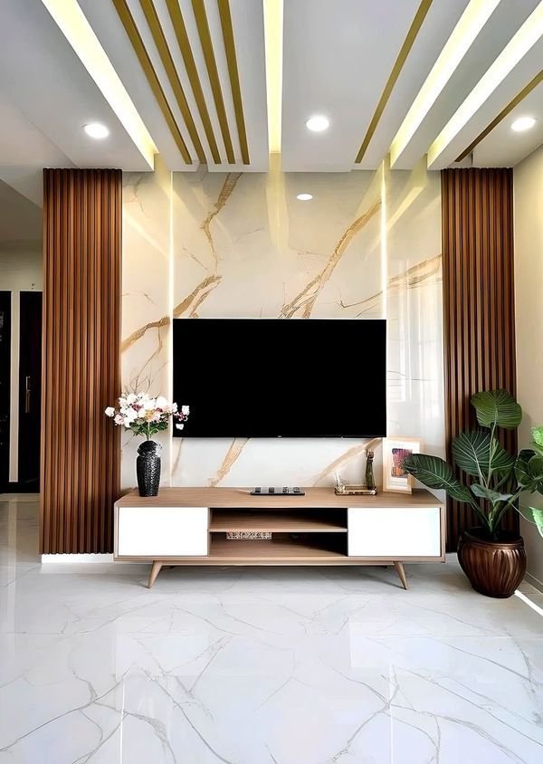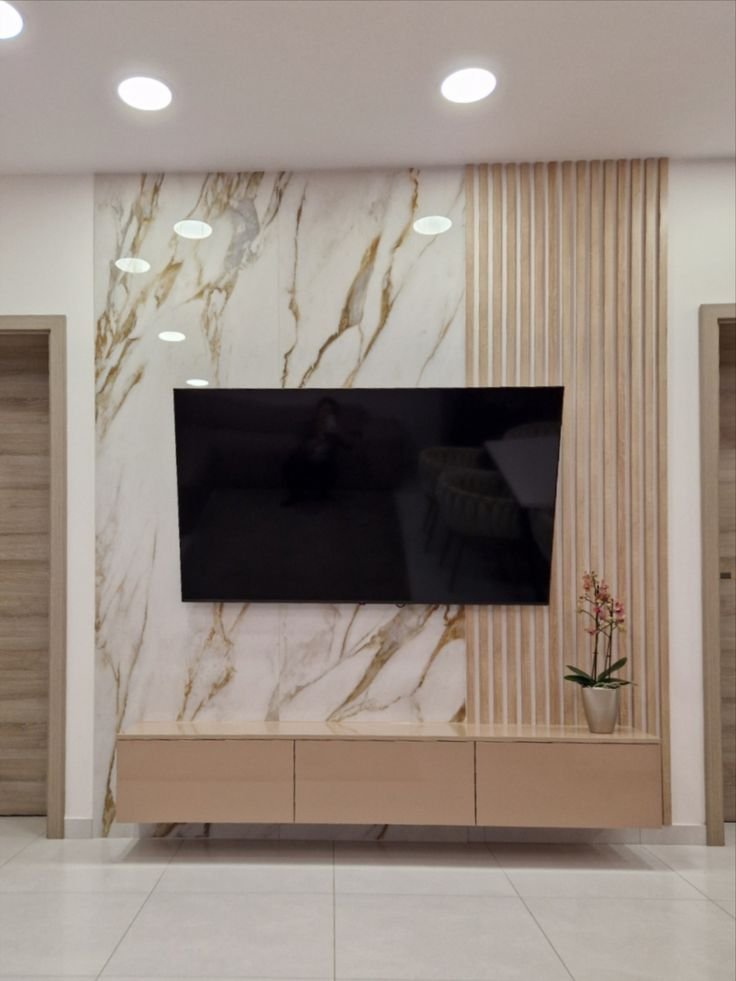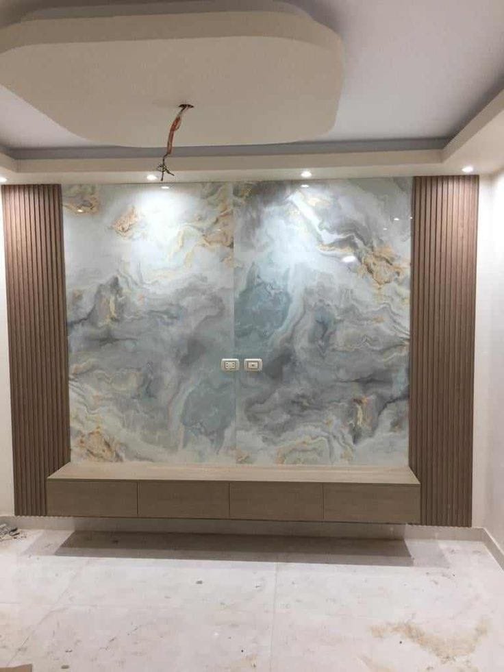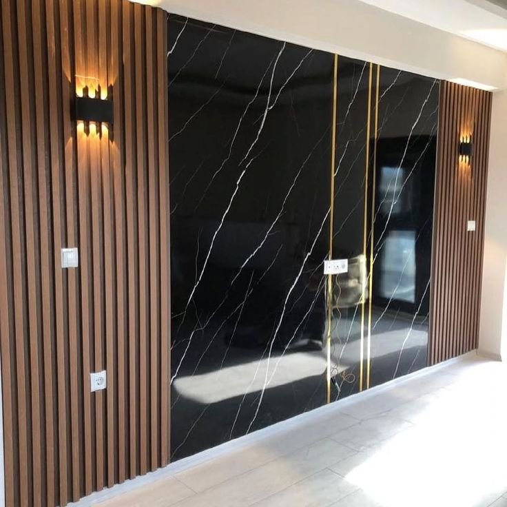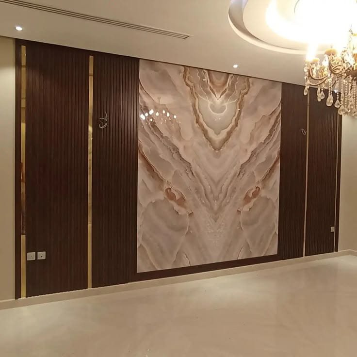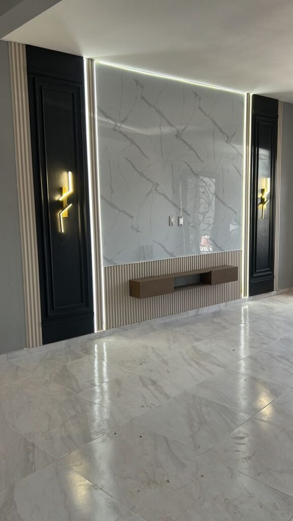 تعتبر خلفية الشاشة هي نقطة الجذب الأساسية في غرف المعيشة. نقوم بدمج بديل الرخام مع “بديل الخشب” وإضاءة “اللد المخفي” (LED Strip) لخلق ديكور مودرن يجمع بين دافئ الخشب وفخامة الرخام.