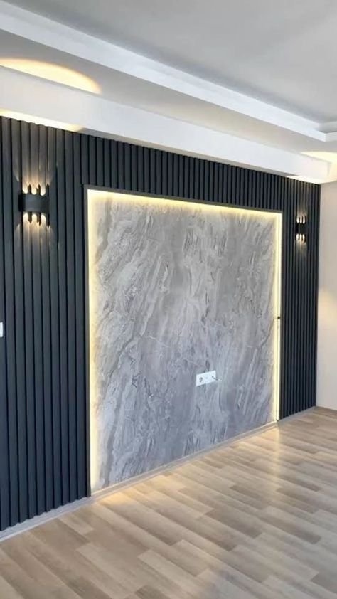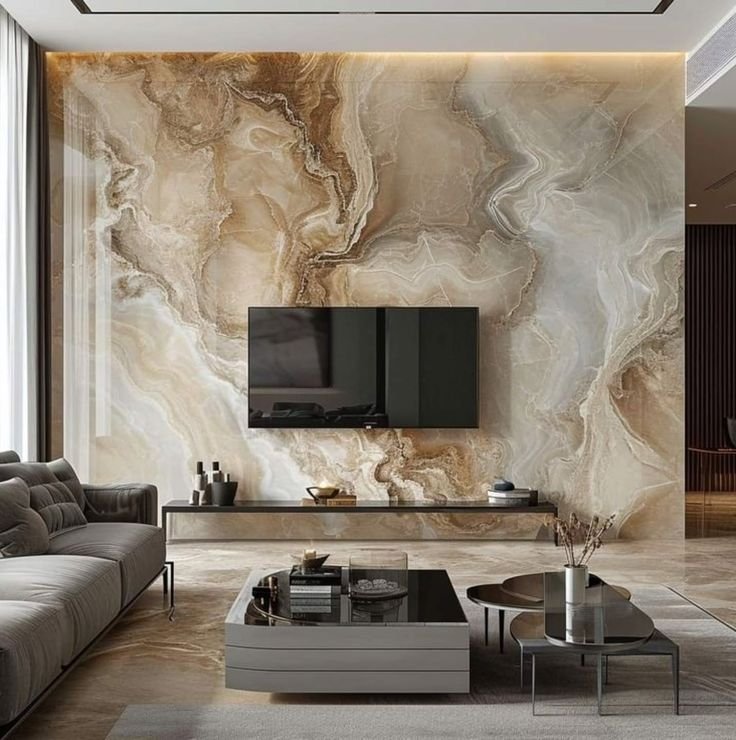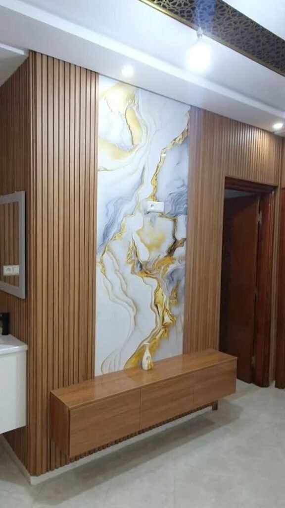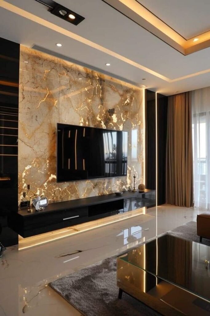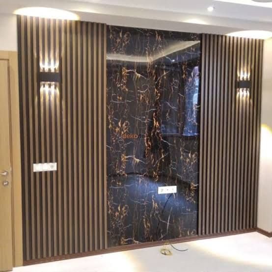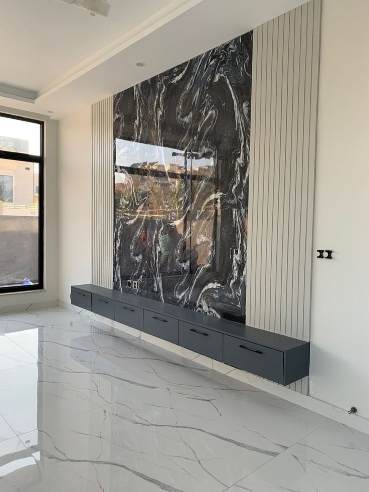 تعتبر خلفية الشاشة هي نقطة الجذب الأساسية في غرف المعيشة. نقوم بدمج بديل الرخام مع “بديل الخشب” وإضاءة “اللد المخفي” (LED Strip) لخلق ديكور مودرن يجمع بين دافئ الخشب وفخامة الرخام.