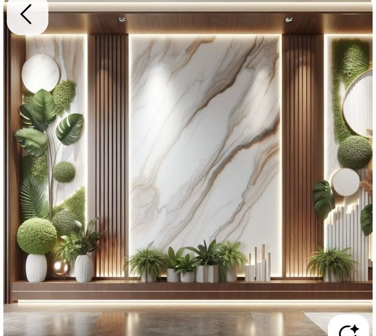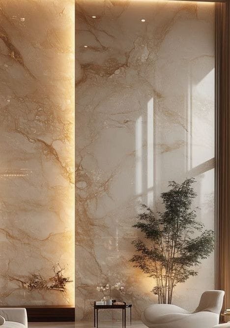 المداخل هي واجهة الضيافة. استخدام ألواح بديل الرخام ذات العروق الكبيرة (Bookmatch) في المداخل يعطي شعوراً بالاتساع والرفاهية، خاصة عند دمجها مع مرايا جدارية أو فواصل استيل.